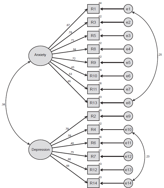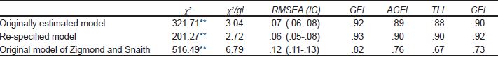 With the second subsample, the sample adequacy tests and a confirmatory factor analysis (maximum likelihood) were performed. It was considered as criteria to verify the goodness of fit of the model: absolute adjustment indexes, Chi-square test (χ2), Chi-square ratio (χ2/gl); adjustments of parsimonious character, Root Mean Square Error of Approximation (RMSEA) with its confidence interval (CI); partial adjustments of absolute character, Goodness of Fit Index (GFI), Adjusted Goodness of Fit Index (AGFI); indexes of incremental adjustment, Tucker-Lewis Index (TLI), Comparative Goodness Index (CFI). Acceptable adjustment values were considered: χ2/gl ≤ 5, RMSEA ≤ .08, GFI ≥ .90, AGFI ≥ .90, TLI ≥ .90, CFI ≥ .90; and excellent fit: χ2/gl ≤ 2, RMSEA ≤ .05, GFI ≥ .95, AGFI ≥ .95, TLI ≥ .95, CFI ≥ .95 (Steppan, Piontek, & Kraus, 2014). With unsatisfactory adjustments, the appropriate re-specifications were made to the model that considered statistical criteria (indexes of modification and factor saturation of each item) and theoretical criteria (conceptual coherence item-factor) in order to maintain the conceptual value of the instrument (Pérez, Medrano, & Sánchez Rosas, 2013). The elaborated re-specifications were evaluated sequentially. The fit of the data to the original model of Zigmond and Snaith was also evaluated.