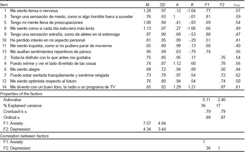 The analysis of the HADS items is shown in Table 1. The mean and standard desviation per item ranged between .65 and 1.28, and .72 and .99 respectively, without evidence of univariate normality (p < .05). The data were adequate to perform factor analysis, KMO index = .84, Bartlett’s sphericity test = 1349.8 (p < .001), determinant of the correlation matrix = .02. The parallel analysis indicated the presence of two factors whose explained variance was greater than the variance explained by random factors. The exploratory factor analysis showed a simple solution in which the items met the requirements of quantity, saturation, and corrected item-total correlation to conform the factors, which at the same time were adapted to the requirements of internal consistency (Table 1). The factors showed a significant positive correlation (p < .001), and together they explained 53% of the variance. The overall internal consistency was Cronbach’s α = .81 and ordinal α = .93.