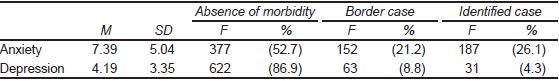 Table 3 indicates the mean and standard desviation of the Anxiety and Depression factors for the total sample, as well as the prevalence of these conditions according to the original cut points.