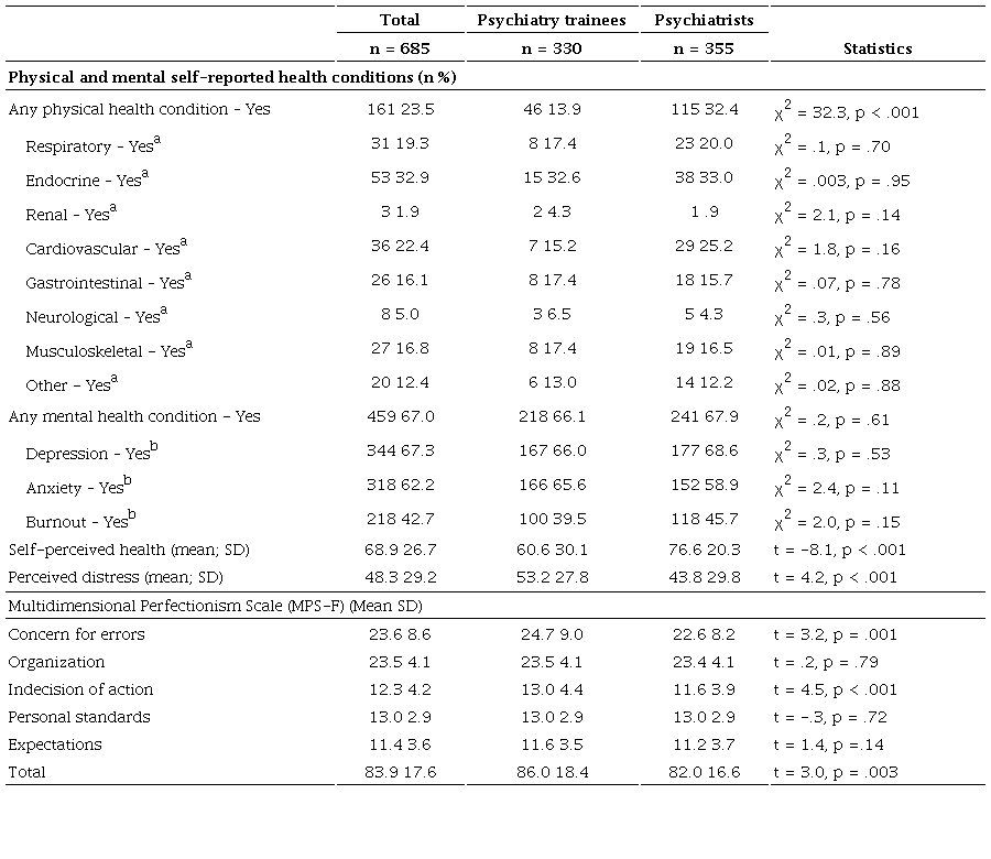 Abstract: Introduction. Self-perceived health (SPH) is related to disease and well-being. Psychiatrists report burnout and mental disorders more frequently than other physicians, while personality traits related to perfectionism may influence the perception of well-being and health in these professionals. Objective. To compare and de- termine the association between demographic variables, health conditions, perceived distress, perfectionism, and SPH. Method. A cross-sectional, retrospective, comparative study was performed through an online sur- vey. Psychiatrists and psychiatry trainees who were willing and able to participate were included. Demographic variables and self-reports of mental and physical conditions were examined. SPH was rated on a 10-point visual analogue scale and perfectionism through the Multidimensional Perfectionism Scale. Comparative analyses and multiple linear regression models were performed. Results. Three hundred and thirty psychiatry trainees and 355 psychiatrists were recruited. Psychiatrists reported more physical conditions (32.4% vs. 15%, p .001), distress (p .001), and perfectionism (p .001). Major depression and anxiety were present over 50% of all participants. A higher SPH was associated with being partnered and having higher distress levels in psychiatry trainees and with the absence of a physical health condition, less concern over errors, and higher personal standards in psychiatrists. Discussion and conclusion. Self-oriented perfectionism may have a significant motivational component, accentuated by competitiveness and individualism. Being married and having higher levels of distress in psychiatry trainees appears to create a sense of satisfaction with achievements. The implementation of strategies to prioritize and meet goals is necessary to have an adequate work-life balance without affecting personal satisfaction or the sense of achievement.