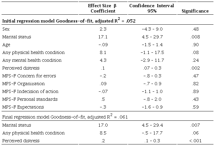 Both linear regression models (for psychiatry trainees and psychiatrists) included demographic, health conditions, perceived distress, and perfectionism dimensions. For each group, different variables were associated with SPH. For psychiatry trainees (Table 2), the most important variable associated with better SPH was being married/partnered. At the same time, a higher level of distress was associated with better SPH in this group.
