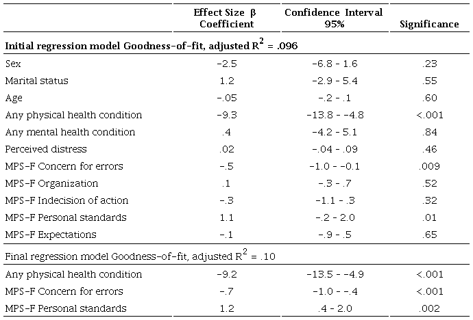 Perfectionism has also been linked to increased somatic expressions of anxiety and increased severity of physical problems - when present - that could affect SPH (Molnar, Sadava, Flett, & Colautti, 2012). Studies on the association between perfectionism and physical health have provided evidence of a direct link, relating it to a worse perception of health in university students (Hadjistavropoulos, Dash, Hadjistavropoulos, & Sullivan, 2007) and adults in the general population (Molnar et al., 2012). In turn, it is considered a predictor of increased disease symptoms over time (Pritchard, Wilson, & Yamnitz, 2007; Saboonchi & Lundh, 2003) and of mortality, even when taking other health-related variables into account , such as age, satisfaction with social support, and number of visits to the doctor (Fry & Debats, 2009).