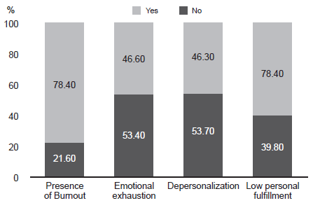 Those who agreed to participate in the study were included. The sociodemographic data of the sample were obtained to subsequently administer the evaluation instrument (Maslach Burnout Inventory). The MBI comprises 22 items assessing three spheres: emotional exhaustion, depersonalization, and personal accomplishment at work. In keeping with the design of the instrument, a case affected by BOS is considered to be a person who scores high on the subscales of emotional exhaustion and depersonalization, (≥ 26 and 9 points respectively) and low on the personal accomplishment subscale (≤ 34 points).