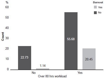 Residents with fewer than 60 minutes a day for meals were four times more likely to present burnout compared to the rest (RR 4.06; 95% CI [2.1, 12.04], p = .009). Regarding work activities, an association was observed between the number of hours spent on notes and the presence of BOS (ro = .319, p = .003). Residents who spent more hours on their notes were 13 times more likely to have BOS than those who spent fewer hours on this task (RR 13.05; 95% CI [2.01, 103.3]).