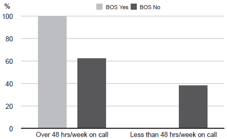 There were no differences in presenting BOS by sociodemographic characteristics, group, or type of specialty. An association was found between presenting BOS and not receiving financial assistance in addition to the specialty grant (ro = .212, p = .047). A slight, statistically significant association directly proportional to the size of the workload was found with the presence of BOS (ro = .229, p = .032). Residents with a workload of over 80 hours were 7.3 times more likely to present burnout than those with a smaller workload (RR 7.34, CI 95% [2.1, 58.7]). Moreover, an association was found between residents who were on call for over 48 hours a week and the presence of burnout (ro = .34, p = .001) (Figures 2 and 3 ).
