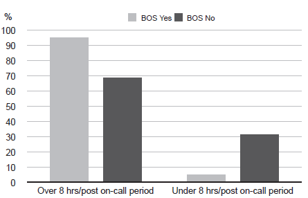 There was a statistically significant, slight and directly proportional association between the number of hours in the “post-on-call” period and the presence of burnout (ro = .249, p = .019). Residents with more than eight “post-on-call” hours were 8.4 times more likely to present burnout than those with fewer hours (RR 8.42; 95% CI [2.4, 67.1]) (Figure 4).
