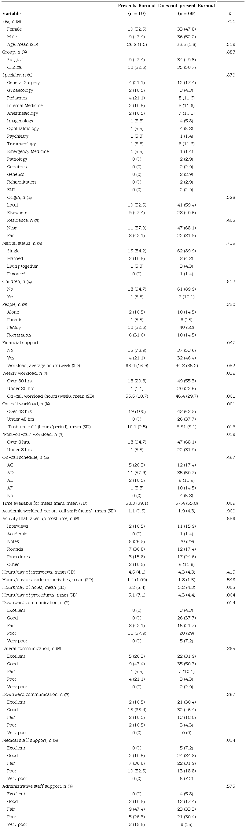 The sample was divided into two groups for analysis based on whether they had burnout syndrome (Table 1).