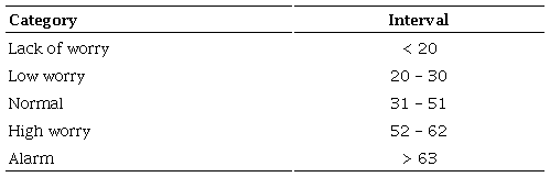 Overestimation of both the positive and negative consequences of excessive, uncontrollable worry is one of the characteristics of Generalized Anxiety Disorder and other mood disorders (González, Bethencourt, Fumero, & Fernández, 2006). This variable and its related aspects have been evaluated through various instruments, such as the following: Why worry?, the Intolerance of Uncertainty Scale (IUS) (Freeston, Rhéaume, Letarte, Dugas, & Ladouceur, 1994), the White Bear Suppression Inventory (WBSI) (Wegner & Zanakos, 1994), The Problem Solving Inventory-Revised (Maydeu-Olivares & D’Zurilla, 1995), Beck’s Anxiety Inventory (BAI) (Beck, Epstein, Brown, & Steer, 1988), the Structured Interview Guide for the Hamilton Anxiety Scale (SIGH-A) (Shear et al., 2001), the Penn State Worry Questionnaire (PSWQ) (Meyer, Miller, Metzger, & Borkovec, 1990), and so on. All the above instruments are reliable and valid and have been used in various populations for studies on worry.