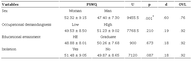 Additionally, we were interested in knowing whether sex, education, and occupational demandingness played an important role in the perception of worry. These three aspects were compared, separating for this variable. For the educational attainment comparison, the two educational extremes were considered: Higher education (50) and Postgraduate (38). In order to determine occupational demandingness the occupational index was used with the considerations proposed by Stern et al. (1994) that resulted from a general census. These occupation categories were: 1. Non-professionalized student (elementary, middle, high school); 2. Homemaker; 3. Non-specialized or semi-specialized (non-professional employees); 4. Employees by trade (carpenter craftsmen, merchants or electricians); 5. Employment careers (general employees, clerks or clerics); 6. Advanced job careers (managers, entrepreneurs or high-ranking public servants); 7. Professional or higher university technician. For the purposes of this article and to be able to obtain two comparable groups, the low requirement group (82), belonging to categories 1 to 5, and the high requirement (173) of categories 6 and 7 were obtained.