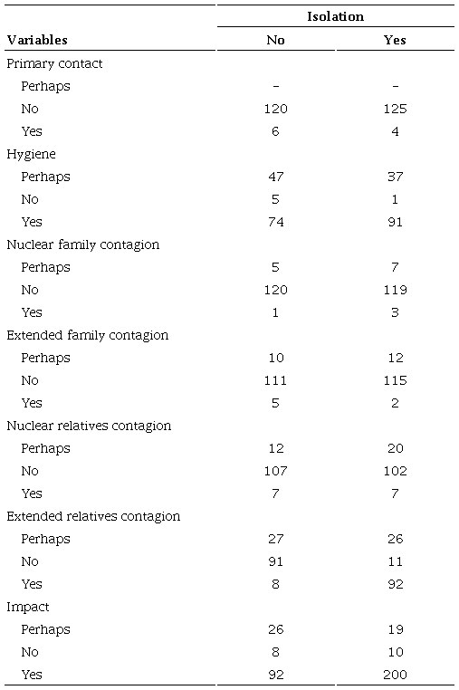 Table 3 shows the answers to questions on contagion measures, attitudes, and behaviors towards COVID-19. The questions that were answered were: Have you had contact with someone with symptoms? (Primary contact), Do you think that you observe the hygiene rules properly? (Hygiene), Do you think any of your nuclear relatives (parents and/or siblings) has symptoms? (Nuclear family contagion), Do you think that any of your extended relatives (cousins, uncles and/or grandparents) has symptoms? (Contagion extended family), Do you think that any of your nuclear contacts (close friends and/or partner) has symptoms? (Contagion in nuclear relations), Do you think any of your extended contacts (neighbors, acquaintances, frequent friends) has symptoms? (Contagion in extended relationships), and Do you consider that your actions have a significant impact on preventing the spread of COVID-19? (Impact).