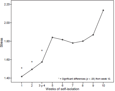 For its part, the ANOVA only revealed significant differences between stress perception over weeks (F = 6.996, p < .001, η2p = .05). Because only one person reported having spent three weeks social distancing, they were incorporated into the group that stated it had spent four weeks social distancing, as a result of which the new group was named “three and four weeks.” Tukey’s post hoc test revealed significant differences in stress perception (F = 13.98, p < .001, η2p = .09) between people who had spent one (M = 1.42; SD = .58), two (M = 1.49; SD = .71), three and four weeks (M = 1.57; SD = .65) and those who had spent ten weeks social distancing (M = 2.14; SD = .23). This indicates that stress perception is higher in those who have spent two and a half months self-isolating than in those who have done so for a month or less (Figure 1).