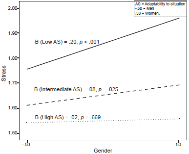 Figure 2 shows that in people with low (ϑX→Y/M = 3.60 = .20, p < .001) and intermediate (ϑX→Y/M = 4.40 = .08, p = .025) levels of adaptability to the situation, stress levels were greater and significantly higher in women than men. However, this effect disappears in the group of people with high levels of adaptability to the situation since no significant differences were observed between gender groups (ϑX→Y/M = 4.80 = .02, p = .669).
