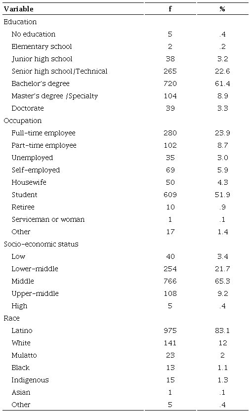The final sample consisted of 1,173 Mexican subjects (522 men [44.5%] and 651 women [22.5%]) with a mean age of 25.99 years (SD = 11.19; range = 12 - 77 years). Most participants declared that they were Latinos, students, with completed undergraduate studies and middle socio-economic status (Table 1).