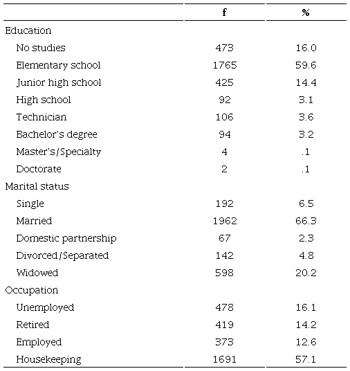 According to the State Population Council of the Estado de México, a million 807 thousand 74 older adults resided in the state in 2019, which accounts for the universe of the study. If the sample size is calculated at a 95% confidence, a sample of 2,960 participants is obtained. Therefore, for the present study a non-probabilistic sample of 2,992 older adults was used. They were residents of 19 regions of the Estado de México, of which, 37.7% were men and 62.3% women, from 60 to 100 years of age (M = 70.45, SD = 7.31). As can be seen in Table 1, more than half of the participants indicated elementary school as their last educational grade, and the highest percentage indicated that they were married. Regarding occupation, the highest proportion of participants reported that they were engaged in household activities and, secondly, those participants who mentioned being unemployed were found.