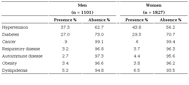First, from the data collected, we look for the medical conditions that would have been diagnosed in our sample. It is of note that 39.1% (1144) of adults indicated that they did not currently have any of the conditions listed in Table 2. As seen in Table 2, the two conditions that were found most frequently were hypertension and diabetes, where in addition in both cases the proportion of women was higher.