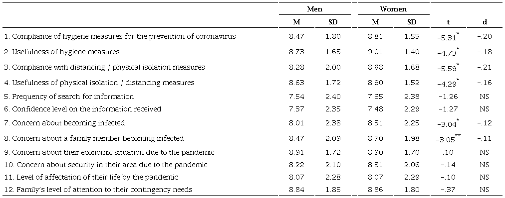 About the concern that our sample refers to the presence of the COVID-19 pandemic, we can say that there are differences between men and women in six of the twelve aspects evaluated. Here we found that in the group of women there are higher levels of concern for the pandemic, of attachment to the recommendations, and of recognition about the usefulness of the measures implemented by health authorities, which seems to be related to cultural aspects of the protective role that women play in Latino societies (Sesento, 2015). Although we should not lose sight of considering that the observed averages for both groups are not low. In addition to this, it is interesting that for both men and women there is a greater concern about a member of their family becoming ill, even above concern for themselves, which denotes in certain form, the role that the family still plays in societies like ours (García-Méndez, Rivera-Aragón, Díaz-Loving, & Reyes-Lagunes, 2015).