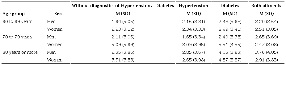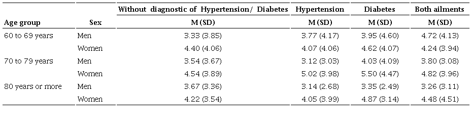Previous evidence indicates that there is comorbidity between depression and some chronic diseases such as diabetes, hypertension, and cardiovascular problems (Chireh et al., 2019; Naveen et al., 2020; Rotella & Mannucci, 2013; Seldenrijk et al., 2015; Vancampfort et al., 2016; Wang et al., 2019), which is consistent with the findings found in the present investigation, since, when analyzing the effect that the type of condition had on depressive symptoms, the results indicated that older adults (specifically women) with both diabetes and hypertension were the ones who presented the most depressive symptoms. There are studies (Boulé et al., 2005; Musen et al., 2008) suggesting a relationship between diabetes and depressive symptoms, this due to the fact that high glucose levels increase the levels of brain neurotransmitters associated with an elevated risk of depressive symptoms.