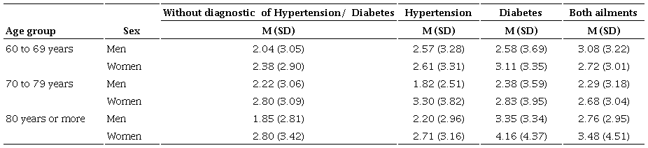 In relation to depressive symptoms (Table 5), the results indicate significant effects on the interaction [F (1, 2922) = 1031.94, p <.001, η= .26]; in particular, the findings showed significant effects by the interaction of type of disease and sex (F = 3.02, p <.050, η = .03), as well as a significant effect by age group and sex (F = 3.08, p < .050, η = .02), where women with both hypertension and diabetes had higher scores on depressive symptoms. In the same way, the women in the group of 80 years or older were the ones who presented higher scores in depressive symptoms.