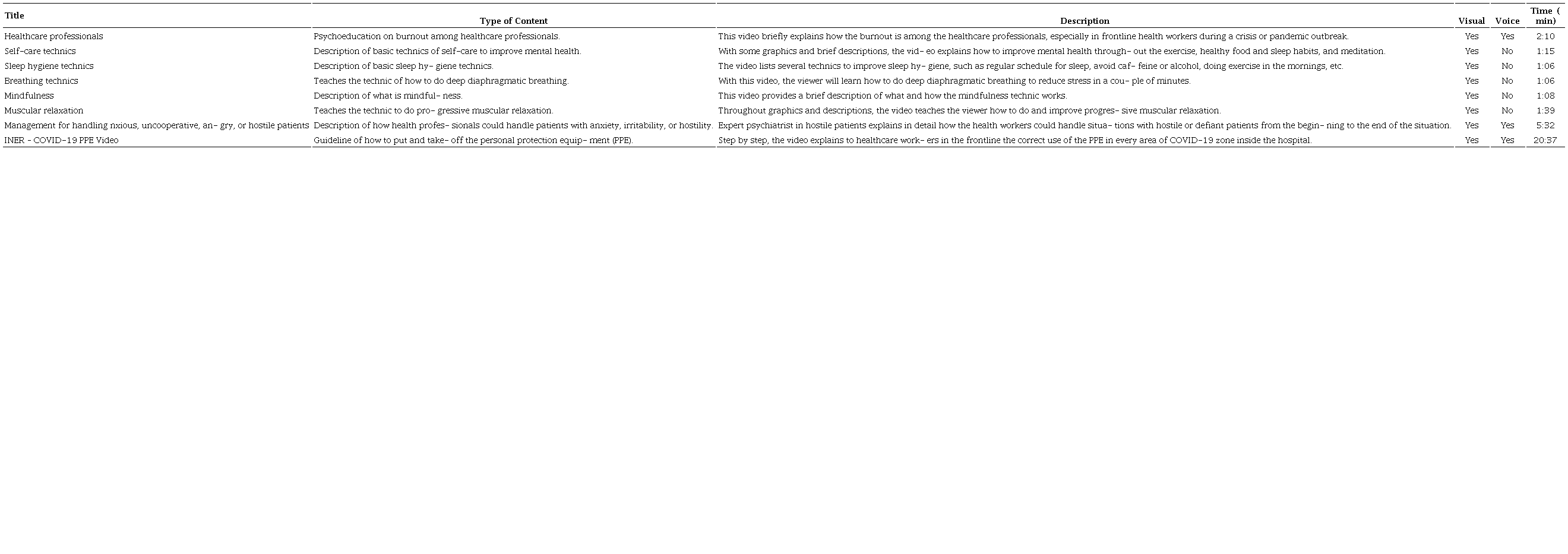 The second set of videos comprised two longer productions, one with strategies for handling anxious, uncooperative, and hostile patients and relatives (available at: https://www.youtube.com/watch?v=Blgr4iWtxV8), and another to offer training in the use of PPE (https://www.youtube.com/watch?v=vkL-OsUH3P0). These videos were developed and produced by specialized personnel at the Instituto Nacional de Enfermedades Respiratorias Ismael Cosío Villegas (INER, Mexican National Institute of Respiratory Diseases) and then approved also by the Secretaría de Salud.