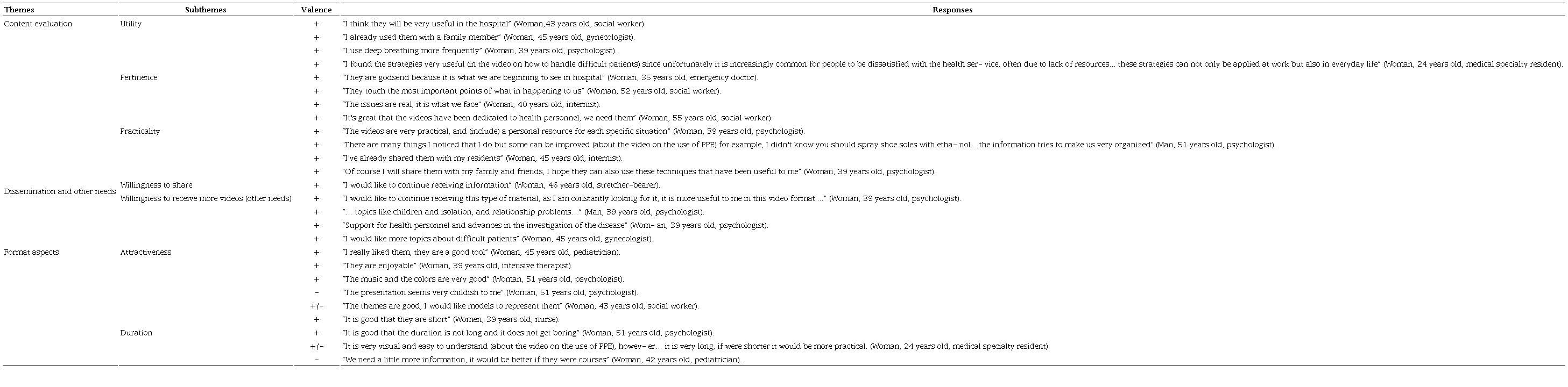 Results: Content analysis of feedback from a final sample of 24 participants ‒75% women, 42 ± 8.4 years old‒ yielded three general thematic categories and seven subthemes: 1. content evaluation, which included three subthemes: utility, pertinence, and practicality; 2. dissemination and other needs, with two subcategories: willingness to share and receive more videos (other needs); and 3. format aspects, also comprising two subthemes: attractiveness and duration. All participants found the videos content very beneficial, relevant, and applicable to the workplace and even in their everyday personal and family life, and were willing to share them and to receive more videos on other issues, including strategies to manage problems related to isolation.