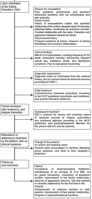 Discussion and conclusion: Here we present an emblematic case showing the importance of getting the parents involved in the treatment of anorexia nervosa.