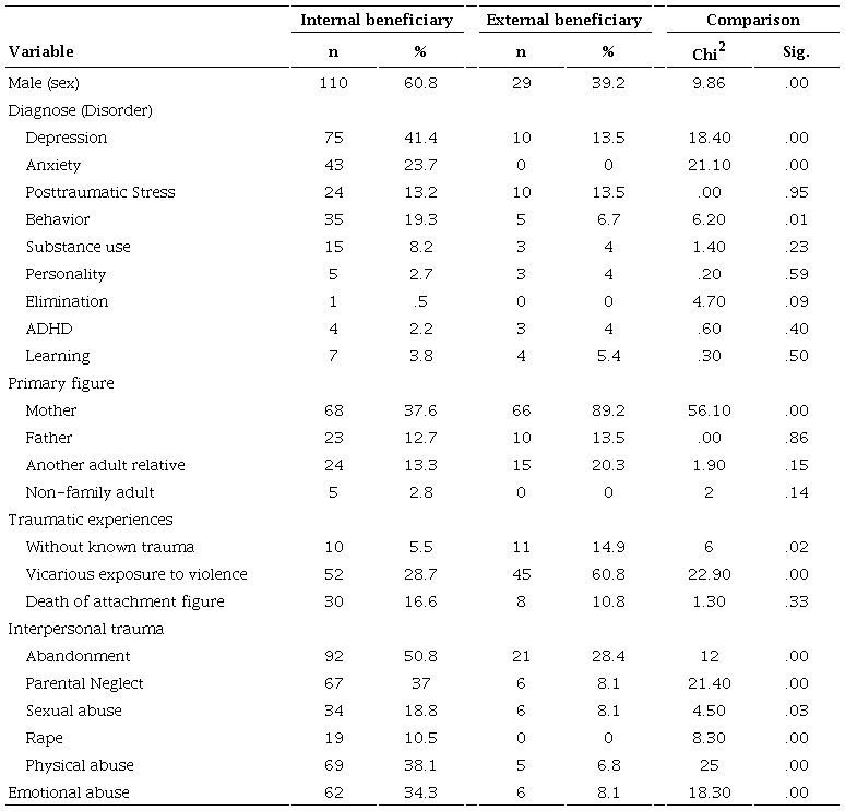 44.7% of participant’s mothers had secondary education as the maximum level of education (33% were unaware of this data); therefore, the socioeconomic extraction of the sample was considered low. A comparative summary of demographic and clinical characteristics of internal versus external beneficiaries is presented in Table 1. It shows that among IB’s, the presence of men predominates. About 90% of EB identified to their mothers as the main reference figure, contrary to IB, whose proportion in this sense was significantly lower. Although the proportion of trauma victims is relatively equivalent for both types of beneficiaries (94.5% and 85.1% respectively), IB suffered more traumatic experiences in all reported modalities, except for the death of the attachment figure, which was equivalent for both types of beneficiaries; and vicarious exposure to violence, the latter with higher reported prevalence for EB. Interpersonal trauma modalities, commonly inflicted by an attachment figure and with a more severe psychopathological consequences, were reported with higher prevalence for IB. Regarding the assigned psychiatric diagnoses, there was a higher prevalence of depressive disorders, followed by anxiety, behavior, and post-traumatic stress disorders. Compared to EB, the proportion of IB who were given these diagnoses were significantly higher, except for post-traumatic stress.