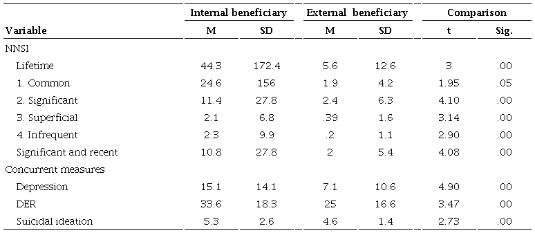 This research sought to describe the risk profile for NSSI on a sample of adolescents who received services for vulnerable population in NGO’s. Our specific objectives were as follows: 1. to describe their demographic and clinical characteristics as well as NSSI frequency, we compared such characteristics by beneficiary type: internal beneficiary (IB) versus external beneficiary (EB); 2. to explore the predictive relationship of NSSI with depression, DER, and suicidal ideation; 3. to compare the average scores on administered measures based on a) QOA and b) NSSI presence/absence.