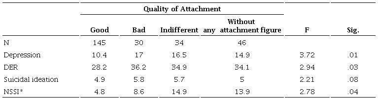 The mental health staff of each NGO identified the main person or persons who maintained a relationship with the adolescent. Results are: 134 adolescents maintained contact with their mother (52.5%), 66 with a brother (25.8%), 44 with a non-familiar adult (17.2%), 33 with his/her father (12.8%), 26 with one or both grandparents (10.1%) and 25 with an uncle (9.7%), while 46 (18%) of them did not maintain contact with any family member nor receive a visit from any other adult. The NGO’s mental health staff typified the QOA in four possible variants: good, bad, indifferent, and without any attachment figure, four groups were formed based on that classification and the average scores of administered measures were compared with an ANOVA; results are shown in Table 3. We can see that general comparison was significant, which could mean that compared to the other QOA modalities, adolescents with positive QOA obtained significantly lower scores, except for suicidal ideation. However, Tukey post-hoc test was non-significant and found no consistent differences between groups.