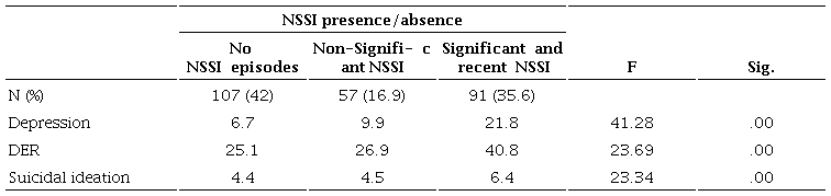 Three groups were formed based on NSSI presence/absence: No NSSI episodes (ISAS-I lifetime score of zero), Non-Significant NSSI (sum of scores of factors 1, 3 and 4 and/or score of four or less in factor 2 and/or more than a year of the last episode); and Significant and Recent NSSI (minimum score of five in factor 2 in the last year). The average score of concurrent measures were compared with an ANOVA; results are shown in Table 4. We can see that the comparison between groups was significant, and with a Tukey post-hoc test we found that the only significant difference was between the group with significant and recent NSSI pattern and the other two groups. Differences between the other subgroups: without NSSI episodes versus non-significant NSSI were no significant for all the concurrent measures.