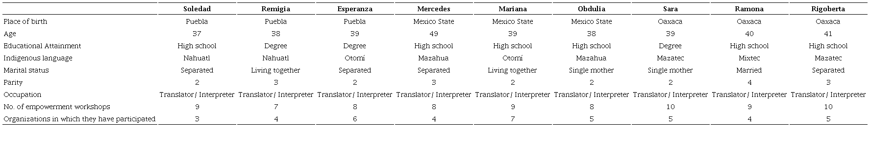 Nine migrant indigenous women from various ethnic groups (Nahua, Mazahua, Otomi, Mixtec, and Mazatec) participated. They were all residents of Mexico City, spoke an indigenous language and Spanish, were an average of 39 years old, and had had fathers with problematic alcohol use. Three came from the state of Puebla, three from the State of Mexico, and three from the state of Oaxaca. The characteristics and pseudonyms of the participants are given in Table 1. All the women worked in a collective as translator-interpreters for indigenous individuals and groups living in the city, those in conflict with the law and health institutions.