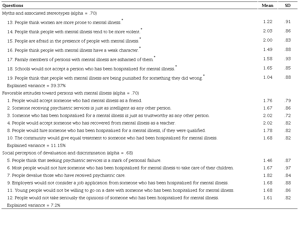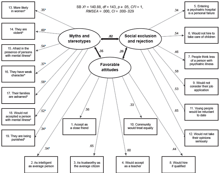 In contrast with the Angermeyer study (2014), in this study we found a high correlation (.82) between the myths and stereotypes factor, which confirmed the conceptual applicability of this factor in the general construct. The decision to keep the factors separate is based on the purpose of the research. The first factor will allow us to identify the myths and stereotypes in Mexico and other Spanish- speaking countries and populations, while the second and third factor will be useful for establishing transcultural comparisons in non-Hispanic regions. Thus, it is possible to capture the specific expressions of stigma at the local level, than those that are more universal, since it is one of the main limitations of the stigma measurements in international studies, which were unable to incorporate the cultural aspects of stigma toward mental illness (Yang et al., 2014).