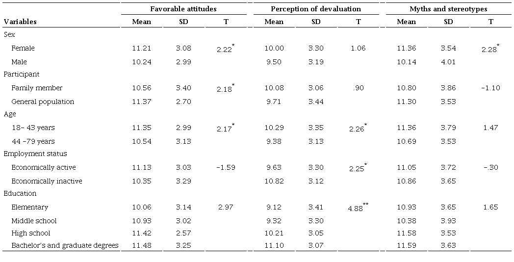 The results show significant differences in favorable attitudes toward mental illness. Women perceived more favorable attitudes in society (M = 11.21, SD = 3.08) than men (M = 10.24, SD = 2.99) (t = 2.22, df = 275, p = .05). There were also significant differences by type of informant. As seen in Table 3, the general population perceived more favorable attitudes (M = 11.37, SD = 2.70) than family members (M = 10.56, SD = 3.40) (t = 2.18, df = 249, p = .05). Likewise there were differences by age, with those 43 and under (M = 11.35, SD = 2.99) showing more favorable attitudes than those 44 and over (M = 10.54, SD = 3.13) (t = 2.17, df = 275, p = .05).
