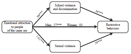 Another finding of the study is that the experiences of sexual violence and school violence and discrimination explained part of the association of being a young ILSS with restrictive behaviors. Even among women, the association between sexual orientation and restrictive behaviors was only observed through the indirect effect of these experiences of prejudice. Victims of sexual violence (Bulgin & Frederick Amar, 2016; Moyer, DiPietro, Berkowitz, & Stunkard, 1997) and bullying (Copeland et al., 2015; Lee & Vaillancourt, 2019) are at a greater risk for engaging in restrictive behaviors. Adversity during childhood is related to low self-esteem, which in turn is associated with restrictive behaviors (Copeland et al., 2015). Subjects who suffer violence may perceive that these experiences are because their sexual orientation is negatively evaluated by others and therefore develop a negative self-image, which may be related to restrictive behaviors (Copeland et al., 2015). In this context, when an LGB person perceives their sexual orientation as a personal defect (Siconolfi et al., 2016), the desire to be thin (materialized as restrictive behaviors) could be a way to offset the stigma associated with the former.