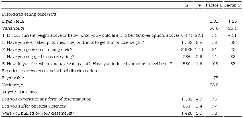 DEBs were evaluated using a five-item scale (Table 1). The response options for the items were yes or no (with a score of zero and one, respectively). The only exception was the first item, which had two options: “above” or “below.” This variable was dichotomized to identify young people who thought their weight was above their ideal. An exploratory factor analysis (Table 1) yielded two factors explaining 53.4% of total variance. Factor 1 was called “restrictive behaviors” and a score was estimated by adding the responses of the variables with high weights in this factor (questions 1, 2, and 3). The second factor had two variables: secret eating and self-induced vomiting. The Alpha Cronbachs on the scale, the restrictive behaviors factor, and the second factor were .56, .60 and .39, respectively. The first factor explained 36.6% of the variance and the second 25.1%. The low internal consistency of the second factor and the fact that it only contained two ítems did not justify creating a composite variable. Each of the variables was therefore separately analyzed.