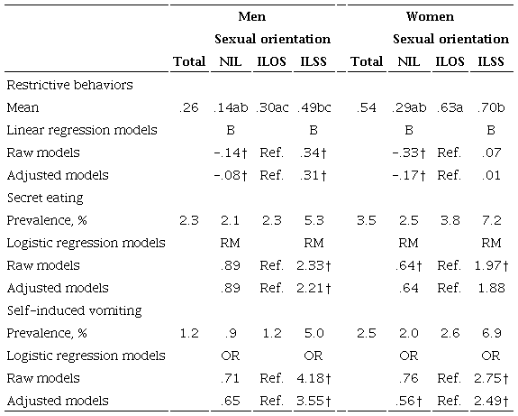 Discusión y conclusión: Los hombres de minorías sexuales mexicanas tienen mayor riesgo de conductas alimentarias de riesgo, y las mujeres de minorías sexuales tienen mayor riesgo de una conducta de tipo purgativo. Parte de las disparidades en conductas restrictivas se explicaron por el mayor riesgo de experiencias de prejuicio que enfrentan los jóvenes de minorías sexuales.