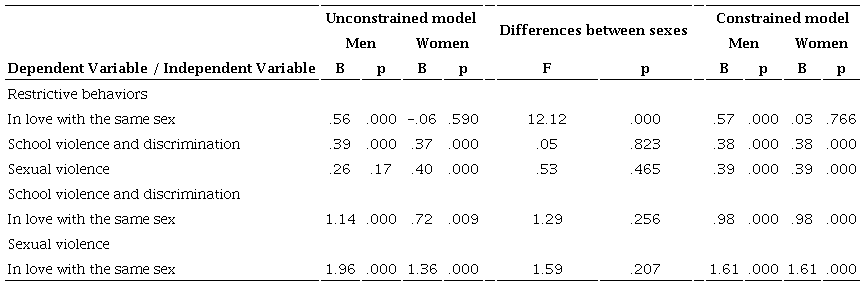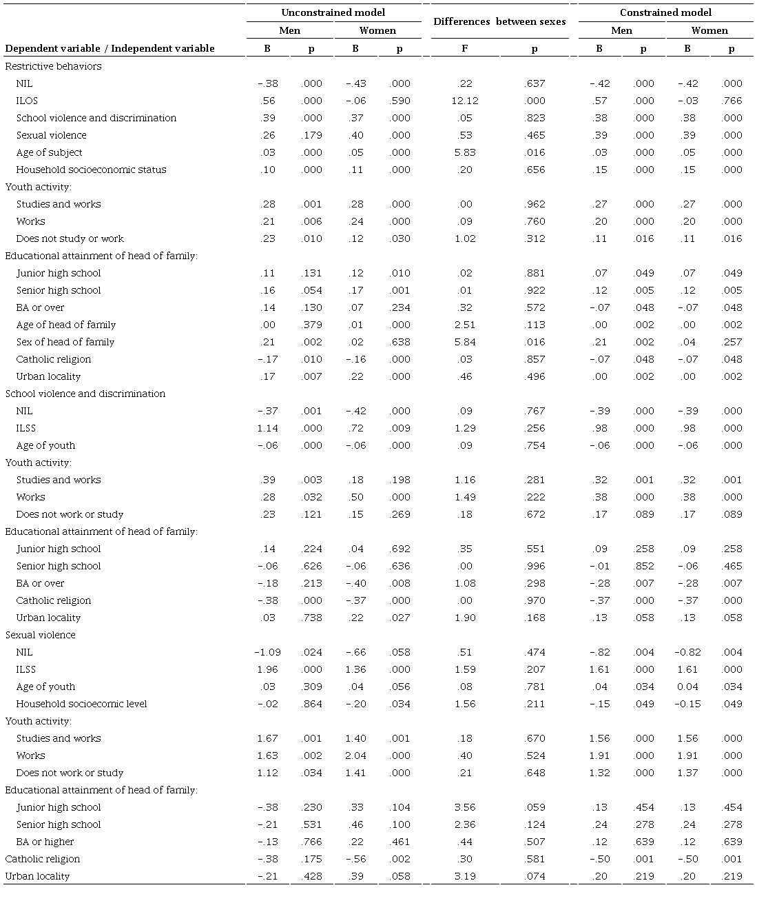 The main results of the GSEM mediation model are shown in Table 3 and Figure 1. Full results are given in Appendix 2. Only one coefficient differed between sexes: among men, being a young ILSS was associated with a direct, positive effect on restrictive behaviors, whereas in women this relationship did not exist. Moreover, being a young ILSS had an indirect effect on restrictive behaviors through its association with school violence and discrimination and sexual violence. The fit of the model with constrained coefficients (BIC = 65757.61) was better than the model with unconstrained coefficients (BIC = 65954.16). In addition, there were significant differences between models (Likelihood-ratio test: chi square = 202.76, p < .000).