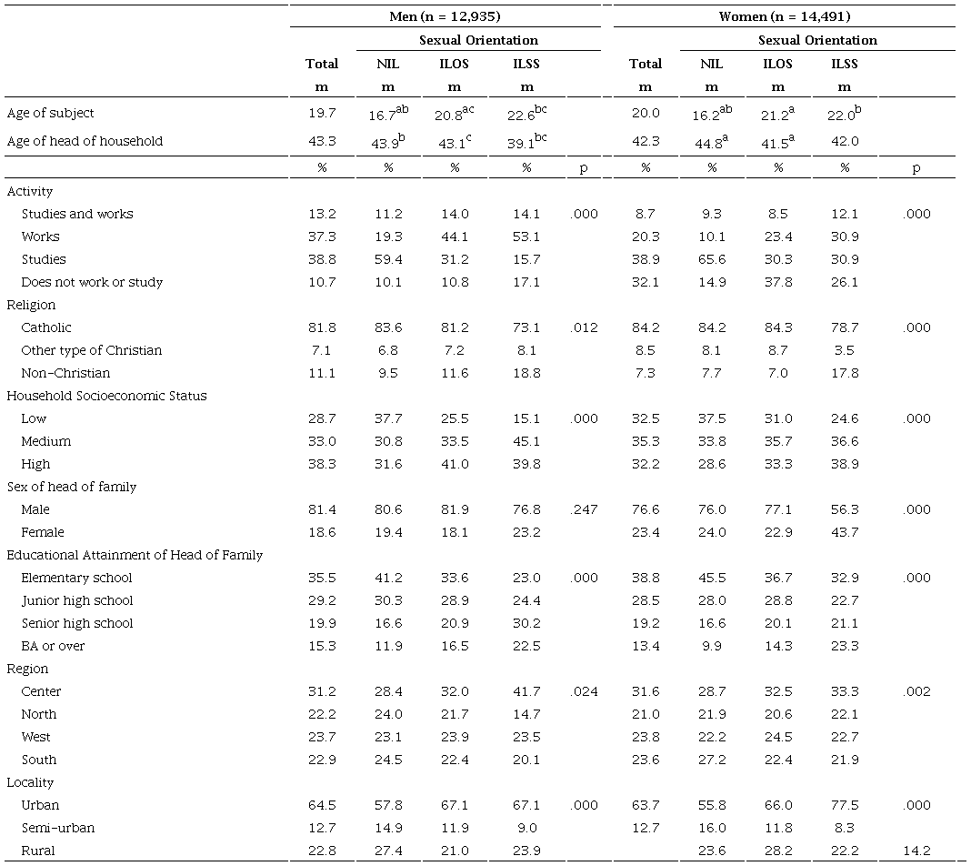 The characteristics of the NYS subjects are given in Appendix 1. Most of the subjects were Catholic, and a third had high or medium SES. Most of the household heads were men and the majority had completed elementary school. Compared with the young ILOS, those ILSS included a higher proportion of subjects who worked, were not Christian, had medium SES, had a head of household with higher educational attainment, and lived in the central region or in urban locations. Among men, young ILSS were older than those ILOS. More ILSS women had female heads of household than those ILOS.
