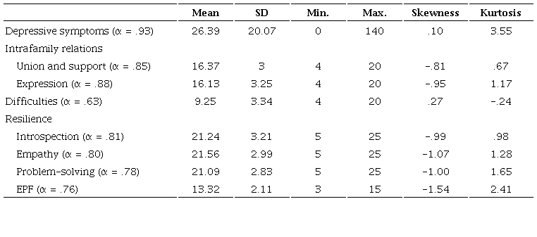 Table 1 presents the descriptive statistics of the study variables. Depressive symptoms had an excellent reliability level, while problem-solving and external protective factors were acceptable. The reliability levels of difficulties were questionable. The rest of the variables showed good reliability. Union and support showed the highest mean among the dimensions of intrafamily relations. Concerning resilience dimensions, empathy had the highest mean.