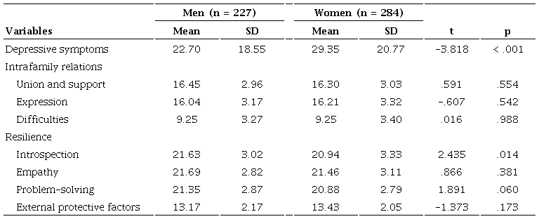 Method: For this correlation cross-sectional study, we evaluated 511 adolescents using the Revised Depression Scale of the Center for Epidemiological Studies, the short version of the Intrafamily Relation Evaluation Scale, and the Revised Resilience Questionnaire for Children and Adolescents. We performed multiple linear regression analyzes by sex using the stepwise method.