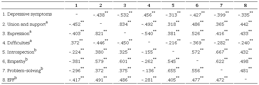 Table 3 shows the matrix of bivariate correlations by sex. For both groups, all associations between the three constructs were statistically significant at a level of p < .01, except between problem-solving and difficulties, with a significance level of p < .05 for young women. Regarding depressive symptoms, the direction of most associations was negative, except for difficulties. For young men, depressive symptoms were highly correlated with expression and had medium associations with the other dimensions such as difficulties, union and support, and empathy. For young women, the highest correlations were medium, established with union and support, external protective factors, expression, empathy, and difficulties.