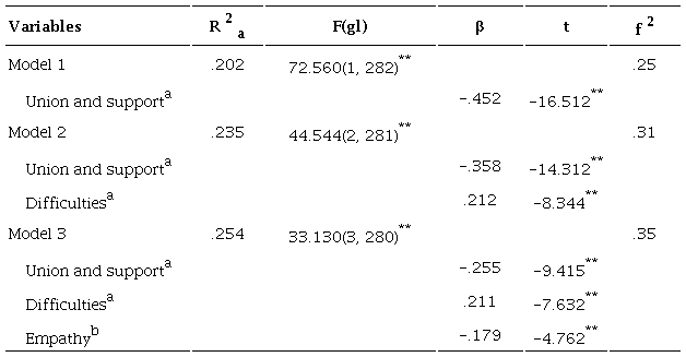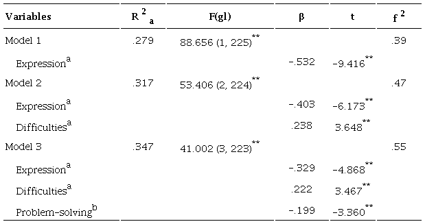 Resultados: Para los hombres, las variables predictoras fueron expresión, dificultades y resolución de problemas (R2a = .34), mientras que para las mujeres fueron unión y apoyo, dificultades, y empatía (R2a = .25).