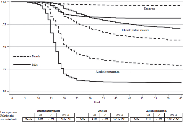 When comparing the curves of the onset of violence, drug consumption, or alcohol consumption, we observed that the latter began at younger ages, was more prevalent in men than in women, grew with age more rapidly than drugs. This indicates that alcohol consumption is one of the highest-risk substances at early ages. IPV grew less rapidly, the age of initiation is at 11 years of age and, above all, it was mostly directed at women.