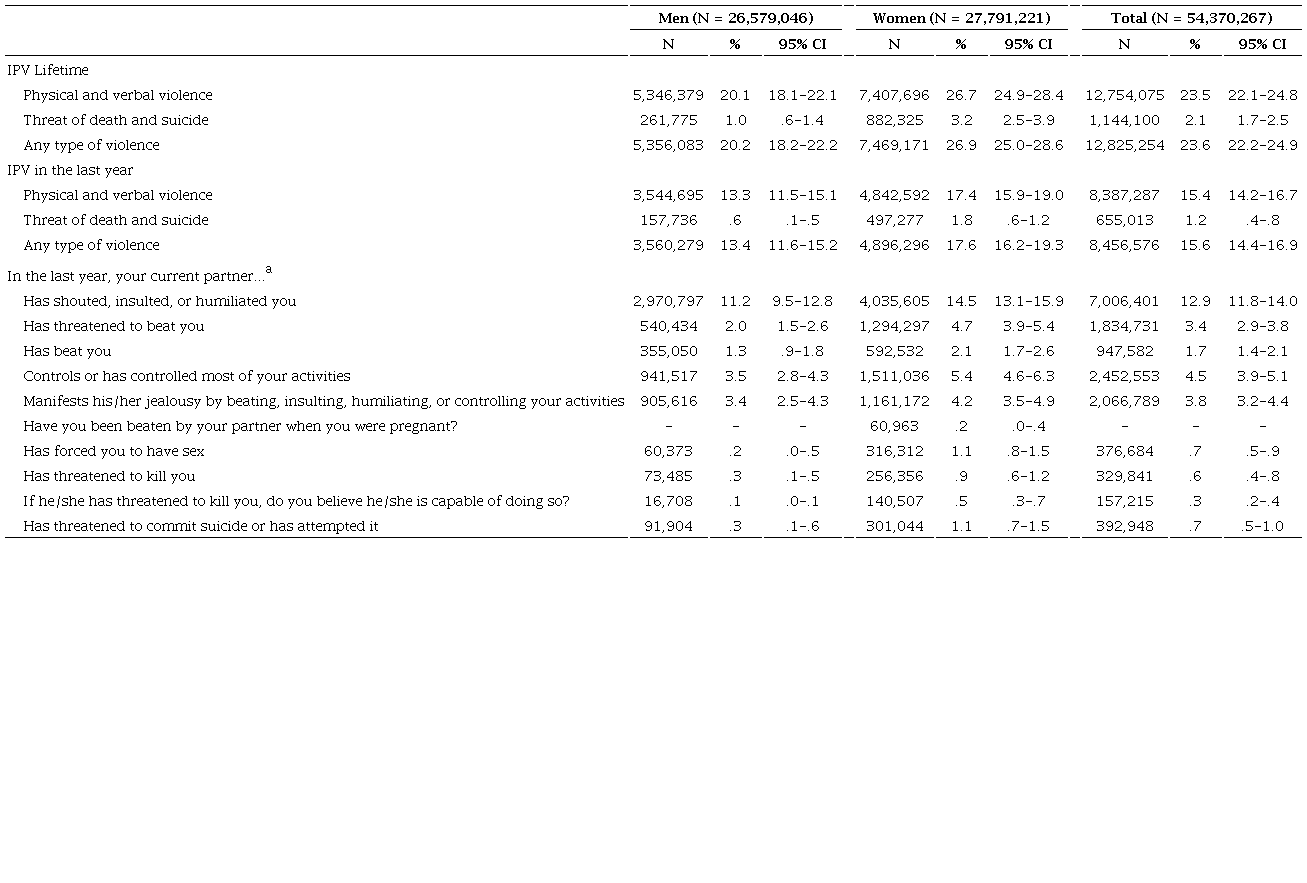 The prevalence of IPV at some point in life in the general population was 23.6%. It was higher in women (26.9%; 95% CI [25.0, 28.6]) than in men (20.2%; 95% CI [18.2, 22.2]). For violence in the last year with the current partner, the prevalence overall was 15.6%, in women 17.6%, and in men 13.4% (Table 1).