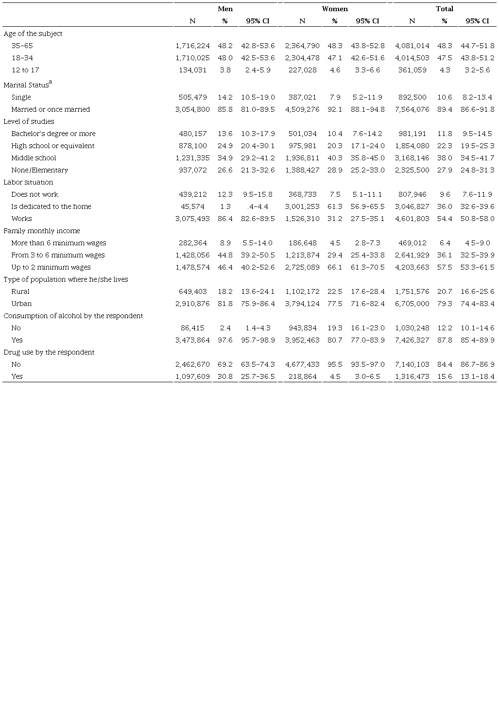 Of the total sample, 50.8% were 35 to 65 years old, 80% were married or lived in a domestic partnership, 27.6% had an elementary education level or lower, 31% were homemakers, 52.2% had a monthly family income of up to two minimum wages (30 USD per day), and 22% lived in a rural community.