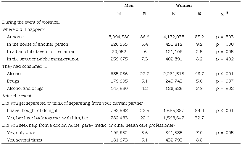 As shown in Table 3, IPV occurred most frequently at home (86.9% men and 85.2% women), but significant differences were found by sex when the event occurred in the home of another person (men 6.4%, women 9.2%) and in a bar, club, or restaurant (men .6%, women 2.5%).