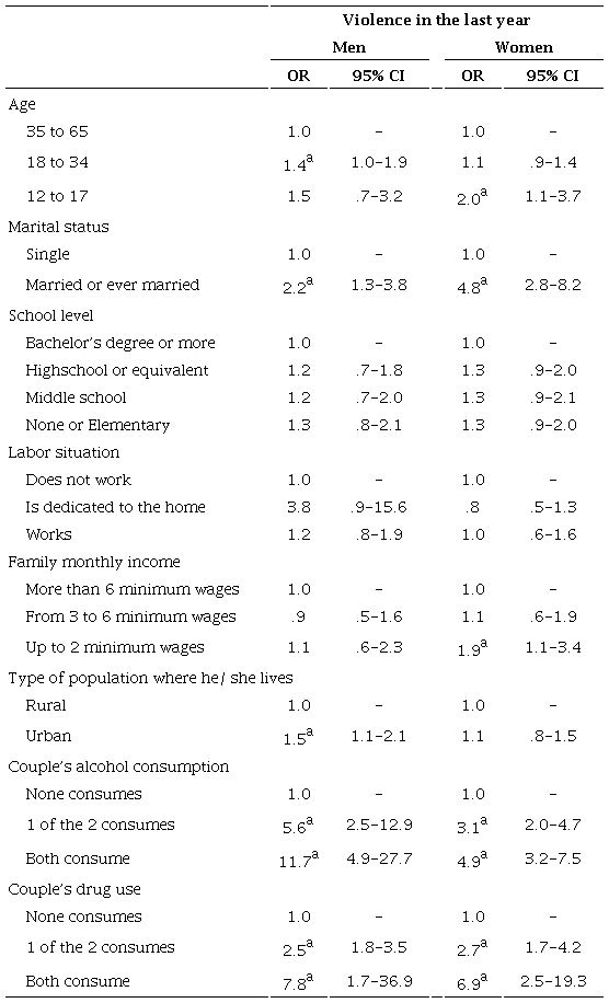 In the case of women, the ones who were more likely to suffer violence by their partner, were those between 12 and 17 years (OR = 2.0; 95% CI [1.1, 3.7]), those who were married or ever married (OR = 4.8; 95% CI [2.8, 8.2]), and those with the lowest salaries (OR = 1.9; 95% CI [1.1, 3.4]). In women, alcohol consumption by their partner increased the risk 2.1-fold, and alcohol consumption by both increased it 3.9-fold. The risk of experiencing violence also increased when one or both partners used drugs (ORs = 2.7 and 6.9, respectively).