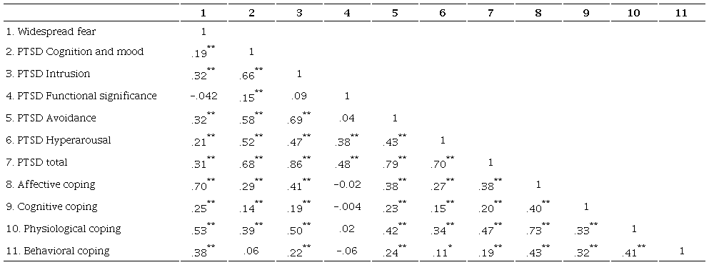 The first analysis performed was the Pearson Product-Moment Correlation including the main targeted variables (coping strategies, widespread fear and post-traumatic stress traits or criteria). Pearson correlations were calculated in order to evaluate possible extreme collinearity among variables (Kline, 2015). According to Kline, correlations of .90 are indicative of extreme collinearity and may result in non-positive definite data matrices. After wards, in a second phase, multiple regression analysis were performed. Data was included in two steps. In the first step, we entered the dependent variable coping strategies and added widespread fear. The second step was a multiple regression of PTSD symptoms predicted by the coping factors. Multiple linear correlations were calculated to evaluate multivariate collinearity (Kline, 2015) and to find what coping variables had statistically significant standardized beta values. Kline indicates that an R2 value greater than .90 reflects extreme multivariate collinearity. Tolerance and variance inflation factor indexes were calculated since tolerance values (1-R2), and all the variables showed less than .10, and variance inflation factor values (1/[1-R2]) lower than 10.0, so no multivariate collinearity was found.