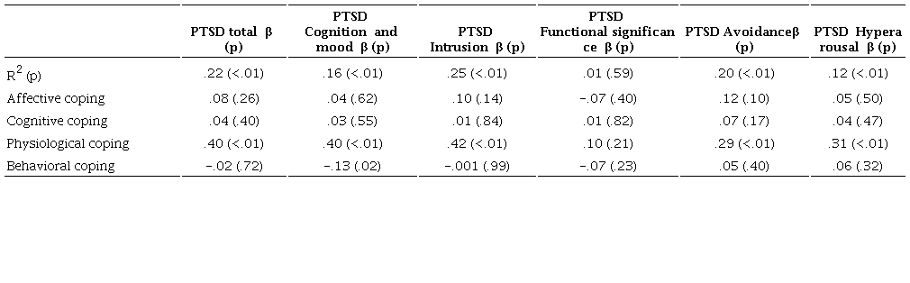 Multiple regressions of PTSD symptoms predicted by the coping factors were analyzed (Table 3). The only multiple regression that was not statistically significant was with PTSD functional significance symptom. The significant R2 values ranged from .12 (PTSD hyper arousal) to .25 (PTSD intrusion). All statistically significant regressions related to the physiological coping variable were significant. Since none of the R2 values was greater than .90, there is no extreme multivariate collinearity in the data (Kline, 2015). Tolerance values ranged from .75 to .99, and variance inflation factor values ranged from 1.01 to 1.28, indicating no collinearity in the data (Kline, 2015).