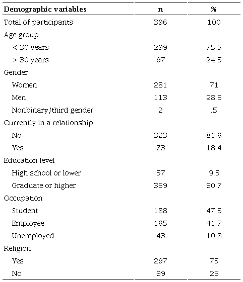 Four hundred thirty-six participants consented to participate in the online survey. We excluded 40 participants that did not meet the selection criteria. We included a total of 396 participants in the study, with a mean age of 26 (IQR, 23-30) years; 71% were women. Most participants were single (81.6%), attained higher education (90.7%), were students (47.5%) or employees (41.7%) or identified with religious practice (75%), mainly Catholicism (87.2%). Demographic data are summarized in Table 1 .