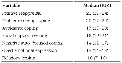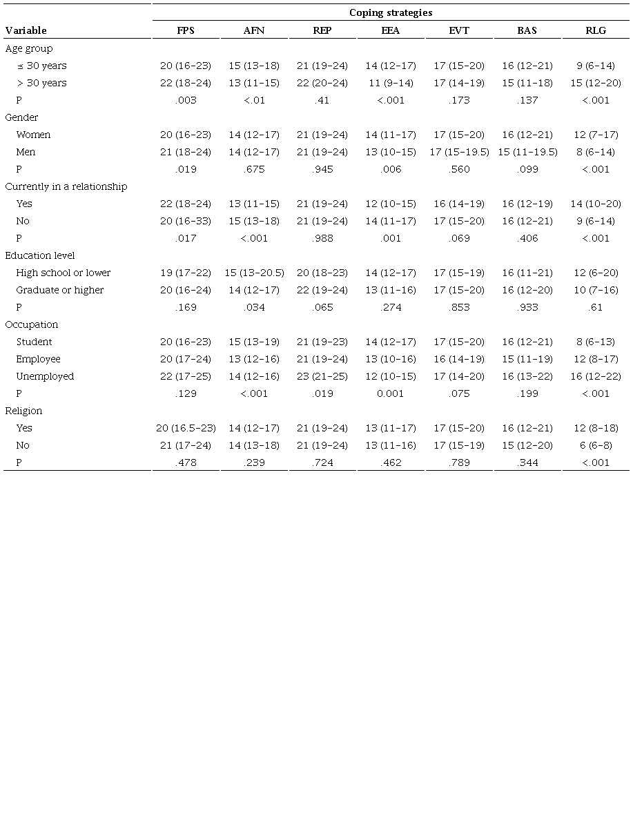 Overall, we found that REP and FSP were the coping strategy subscales that scored highest, with 21 (IQR, 19-24) and 20 (IQR, 17-24), respectively. The RLG subscale reached the lowest score, with 10 (IQR, 7-16) ( Table 2 ). These scores were consistent within demographic subgroups ( Table 3 ).